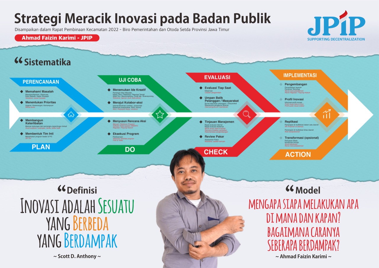 Terkait inovasi, Ahmad Faizin Karimi peneliti The JawaPos Institute of Pro-Otonomi (JPIP) yang juga menjadi tim penilai Sinergisitas Penyelenggaraan Pemerintahan di Kecamatan (SP2K) Jatim menjelaskan proses penciptaannya secara sistematis. “Dimulai dari pemetaan masalah, uji coba, evaluasi, dan baru dilakukan implementasi secara luas. Pada masing-masing tahapan tersebut ada beberapa langkah yang harus dilalui agar inovasi yang dihasilkan nantinya tidak sekedar bagus dari sisi namanya saja tapi juga memiliki tingkat kematangan dan dampak yang positif bagi masyarakat,” terangnya.