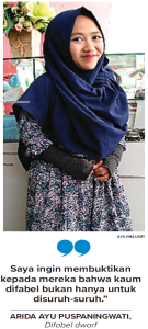 ”Jadi, dulu itu saya trauma. Melihat kakak saya ditolak dengan alasan difabel,” terang Ayu kepada JPIP di tempat magangnya sebagai admin, yakni Astra Daihatsu Malang, Senin (19/11). Kakak keduanya, Prastyo Wira yudha, ditolak beberapa SMP karena juga mengalami disabilitas dwarf seperti Ayu. Yakni, pertumbuhan seluruh tubuh terhambat sehingga tinggi badan tidak melebihi 140-an sentimeter. Ayu memiliki tinggi 120 sentimeter di usianya yang kini 20 tahun.
