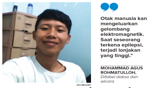 MOHAMMAD Agus Rohmatulloh punya impian membantu pengidap epilepsi seperti dirinya. Pemuda dari Mojoagung, Jombang, itu merasa belum ada peralatan medis yang bisa digunakan pengidap epilepsi untuk mendeteksi kemunculan penyakit tersebut. Karena itu, difabel daksa dan wicara tersebut memilih studi di Jurusan Informatika Universitas Pesantren Tinggi Darul ‘Ulum Jombang.