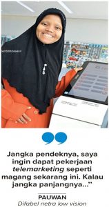 ’’Saya bisa terhubung dengan dunia luar setelah mengisolasi pergaulan sejak ibu meninggal. Jangka pendeknya, saya ingin dapat pekerjaan telemarketing seperti magang sekarang ini. Kalau jangka panjangnya sih ingin mendirikan lembaga bisnis kolaborasi kelompok ’Antusias’ di Ayo Inklusif!,’’ ungkapnya optimistis. (*)