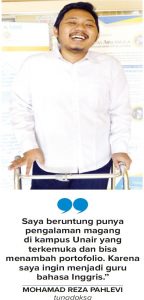 MOHAMAD Reza Pahlevi tanpa kesulitan mengentri data-data penelitian ke dalam lembar kerja komputer di depannya. Sarjana pendidikan bahasa Inggris dari Universitas Brawijaya Malang itu tengah merangkum data penelitian. Pemuda yang lulus pendidikan S-1 pada 2017 itu magang sebagai asisten editor di jurnal ilmiah Masyarakat, Kebudayaan, dan Politik (MKP) FISIP Unair. Selain me-review artikel jurnal, dia membantu para dosen membuat laporan penelitian.