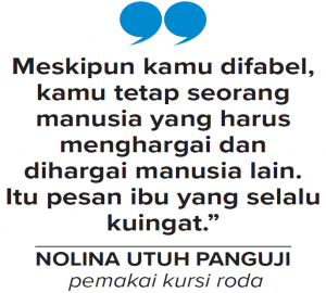 Untuk keteguhan hati dan kekuatan itu, dia terinspirasi Suciamik, almarhumah ibu kandungnya. Nolina berprinsip, difabel tidak boleh dianggap remeh. Penyandang disabilitas juga mam pu bersaing dengan yang lain. ”Meskipun kamu difabel, kamu tetap seorang manusia yang harus menghargai dan dihargai manusia lain. Itu pesan ibu yang selalu kuingat,” kata Nolina.