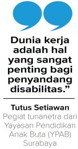 Di lingkungan tunanetra, lanjut Tutus, sebenarnya sudah sering dilakukan pelatihan keterampilan seperti operator telepon, presenter, dan lainnya. Namun, ketika pelatihan sudah selesai, mereka mengalami kebuntuan. ’’Setelah dilaksanakan pelatihan, follow up-nya tidak ada. Kami mau magang, kami bingung mau di mana?’’ ucap Tutus, aparatur sipil negara (ASN) yang tunanetra, itu.