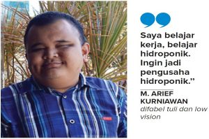 MOCHAMMAD Arief Kurniawan menapaki jalan hidup yang dia cintai: menekuni hidroponik. Mengikuti program Capacity Building for Person with Disabilities Ayo Inklusif!, Wawan –panggilannya–menemukan jalan fokus tanam-menanam itu. Kini Wawan sedang mengikuti pemagangan sebagai staf corporate social responsibility (CSR) United Tractors (UT).