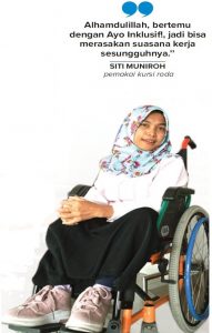 Muniroh sangat bersyukur karena merasakan dunia kerja yang memerlukan keahliannya. ’’Alhamdulillah bertemu dengan Ayo Inklusif!, jadi bisa merasakan suasana kerja sesungguhnya,’’ kata lulusan SD Negeri Telogoretno, Podang, Lamongan, itu. Disabilitas dia dapatkan saat masih bayi berusia 1 tahun. Saat itu dia mengalami sakit panas, lalu dibawa orang tuanya berobat ke dokter. Tapi, kemudian diketahui dia terjangkit polio yang membuatnya kehilangan fungsi kaki.